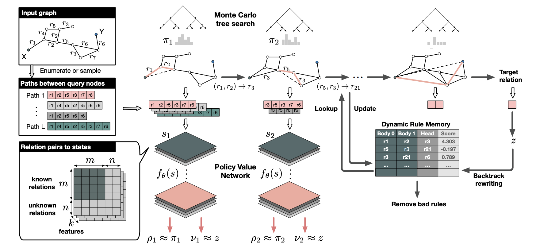 We propose R5, a relational reasoning framework based on reinforcement learning that reasons over relational graph data and explicitly mines underlying compositional logical rules from observations. R5 has strong systematicity and being robust to noisy data. It consists of a policy value network equipped with Monte Carlo Tree Search to perform recurrent relational prediction and a backtrack rewriting mechanism for rule mining. By alternately applying the two components, R5 progressively learns a set of explicit rules from data and performs explainable and generalizable relation prediction.